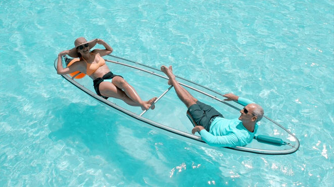 Experience the enchanting waters of Aruba in a unique way with our clear kayak drone shoot. Glide over the crystal-clear Caribbean Sea in a transparent kayak.